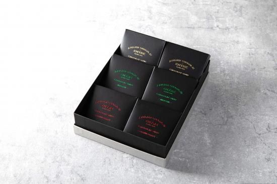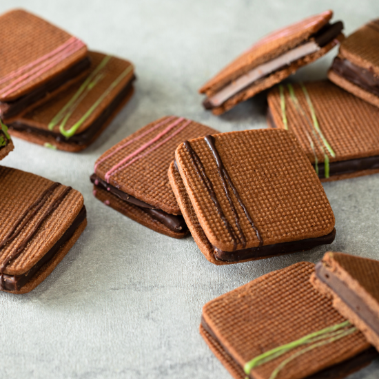 チョコレートサンドの中に少し苦みのある抹茶の生チョコレートを閉じ込めました。チョコレートサンド全体のバランスを考え、カカオ×抹茶の香りを感じられる、厳選抹茶を使用しております。カカオと抹茶がお互いの味を邪魔せず、引き立て合うことで紅茶にもお抹茶にも合うようなお菓子に仕上がりました。